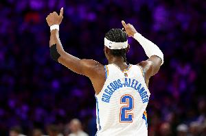 本场比赛,亚历山大出战33分钟,投篮19中16,三分2中2,罚球7中6,砍下40分7篮板11助攻1抢断,正负值+23!